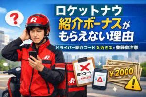 Rocket Now(ロケットナウ)紹介ボーナスがもらえない理由を解説。ドライバー紹介コードの入力ミスや登録前の注意点、初回配達完了など、ボーナス受け取りの条件をわかりやすくまとめています。