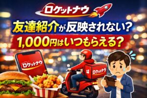 Rocket Now(ロケットナウ)の友達紹介が反映されないと不安な人へ。紹介リンクからダウンロードし、クーポンを使って注文しても1,000円は注文時点では付与されません。実体験をもとに、いつ反映されるのかを注文者向けに解説します。