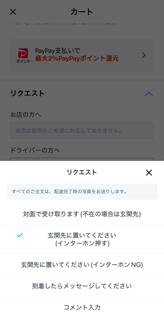 「対面(不在時は玄関先)」を選ぶと、在宅時は対面、不在時は自動で玄関先置き配になる
