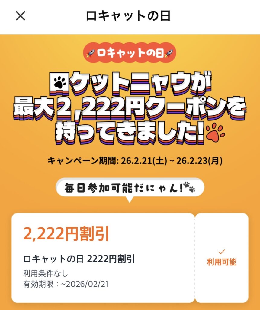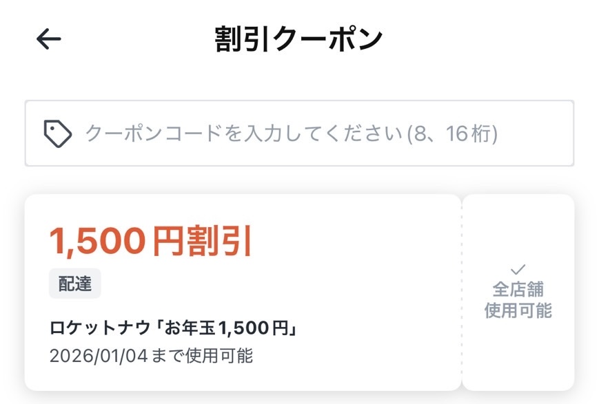 ロケットナウの抽選クーポンは、